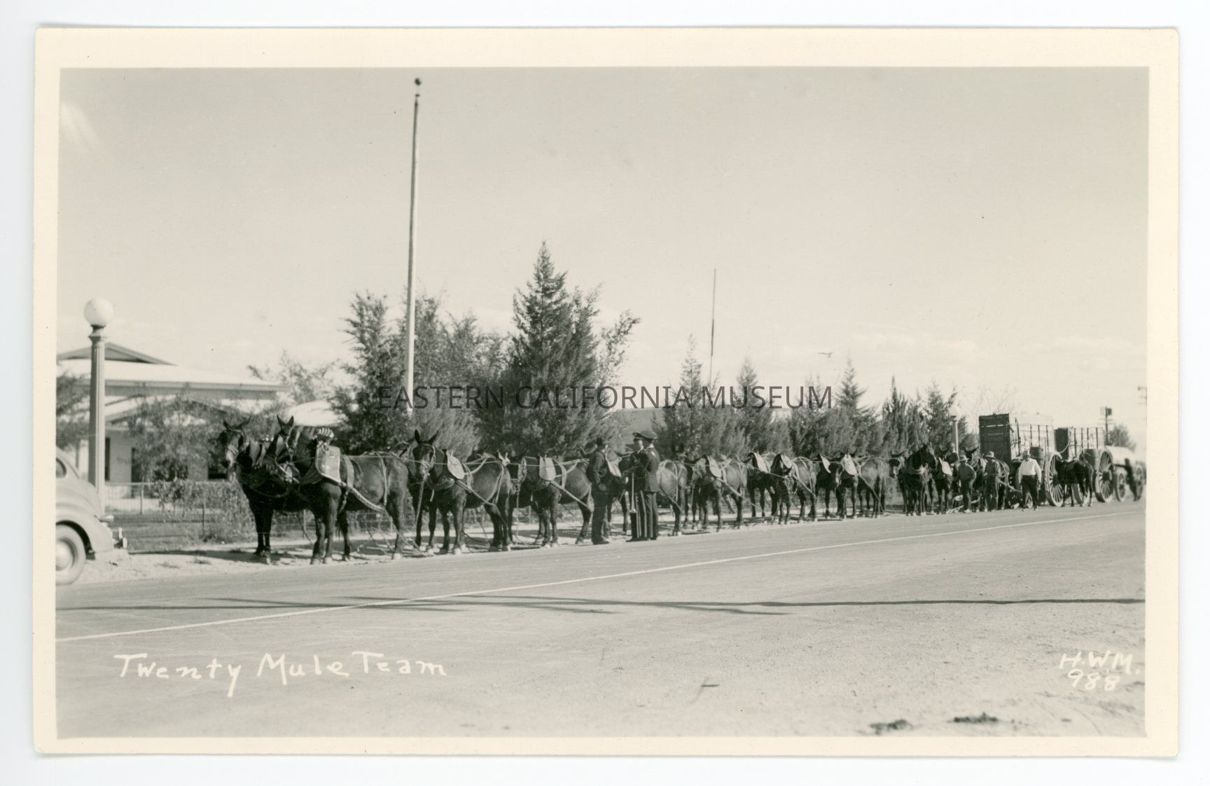 Photo postcard titled, "Twenty Mule Team" taken by photographer H. W. Mendenhall and given his ID #988. It shows a twenty mule team hauling two Borax wagons down a paved road. There is a building in the background, an automobile parked in front of the lead mules, and there are at least six men in the photo. Two of the men appear to be in uniform.Made/Created