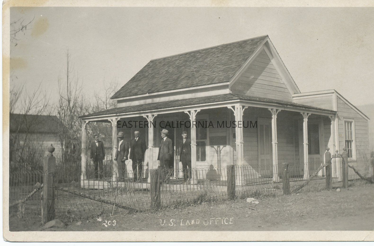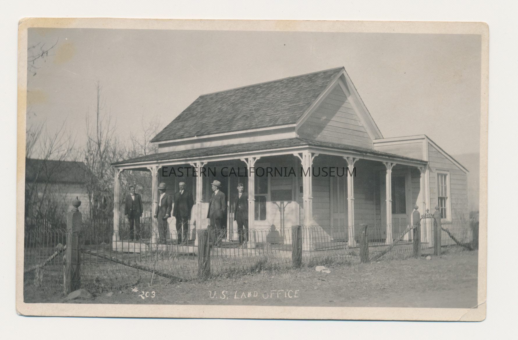 Photo postcard titled, "U.S. Land Office." No photographer information, but it was given identification number 203. Shows five men standing on the covered porch of a white house.