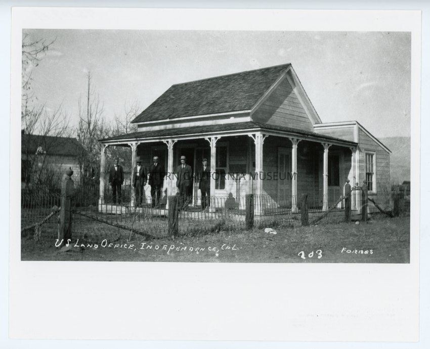 Photo of a house with five men standing on the porch. Written on front: U.S. Land Office, Independence, Cal., Forbes, 203.
