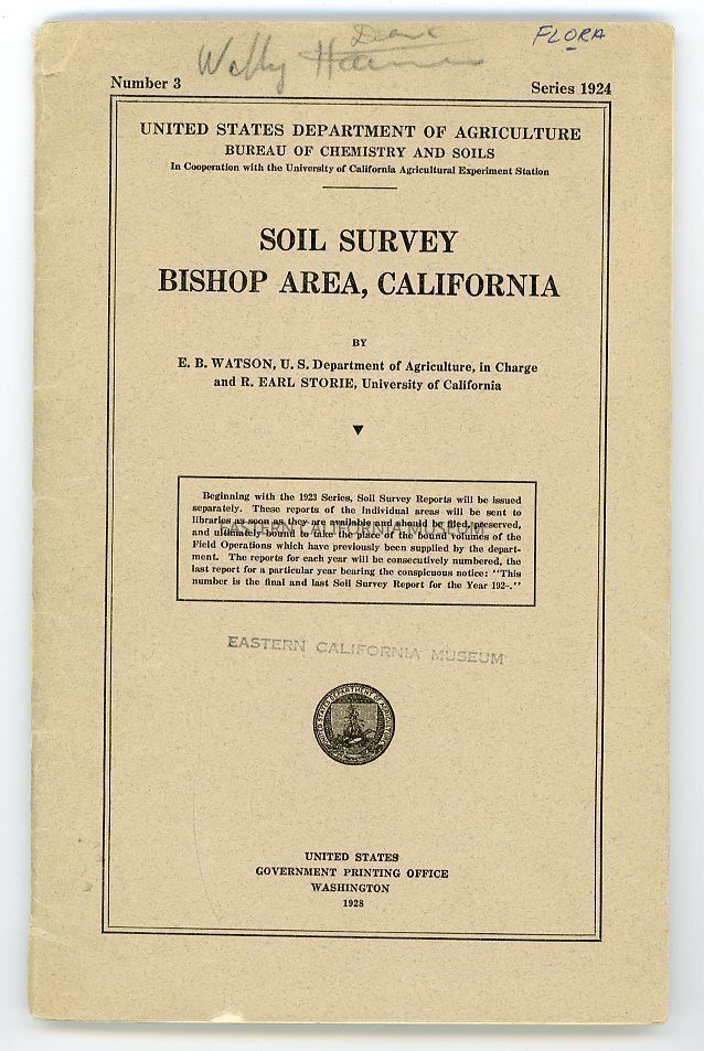 "United States Department of Agriculture, Bureau of Chemistry and Soils, Series 1924, No. 3: Soil Survey of the Bishop Area, California" has one map in a brown envelope.Publication Details