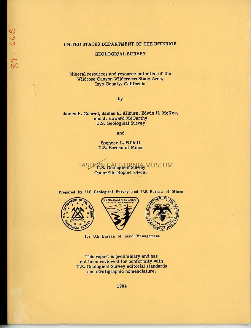 United States Department of the Interior Geological Survey Open-File Report 84-665: Mineral Reserouces and Resource Potential of the Wildrose Canyon Wilderness Study Area, Inyo County, California