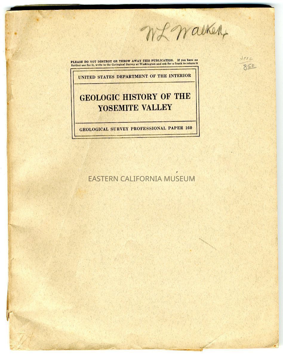 "United States Department of the Interior, Geological Survey, Professional Paper 160: Geologic History of the Yosemite Valley" only contains plates 2, 7, and 29 in back envelope. Back cover is detached. "W. L. Walkens 2-3-31" inscribed on title page.Publication Details