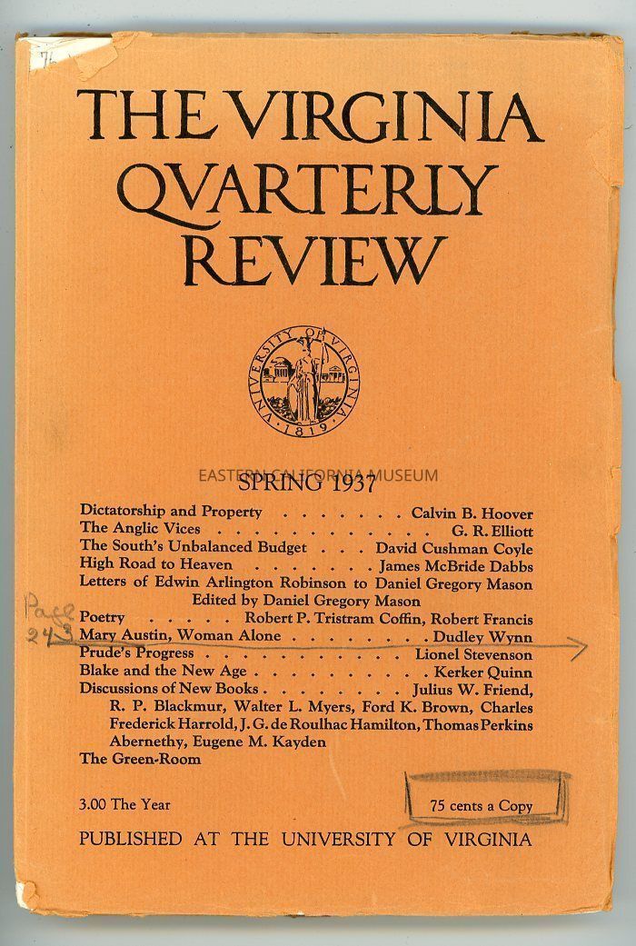 "Virginia Quarterly Review, Vol. 13, No. 2, Spring 1937" contains an article titled "Mary Austin, Woman Alone" by Dudley Wynn.Publication Details