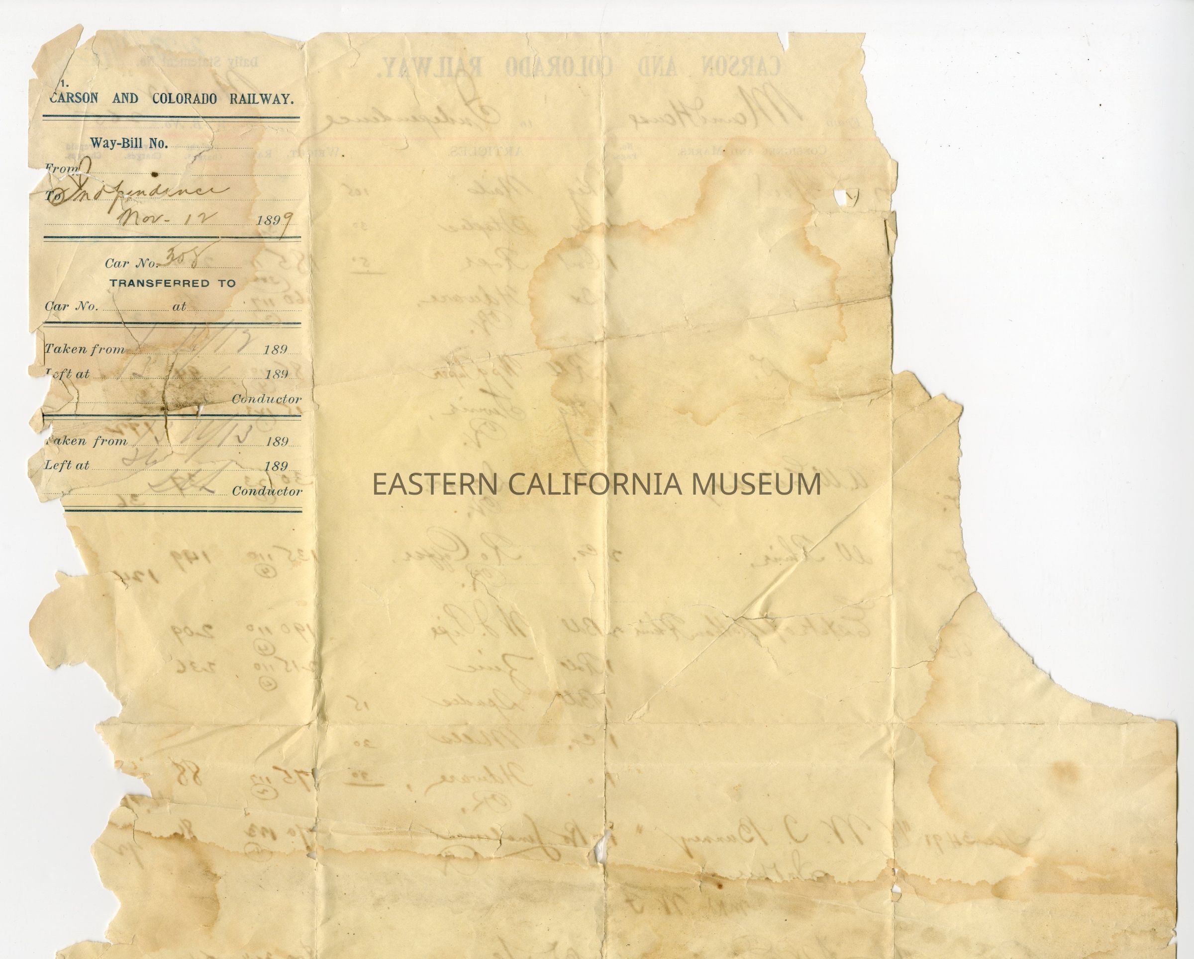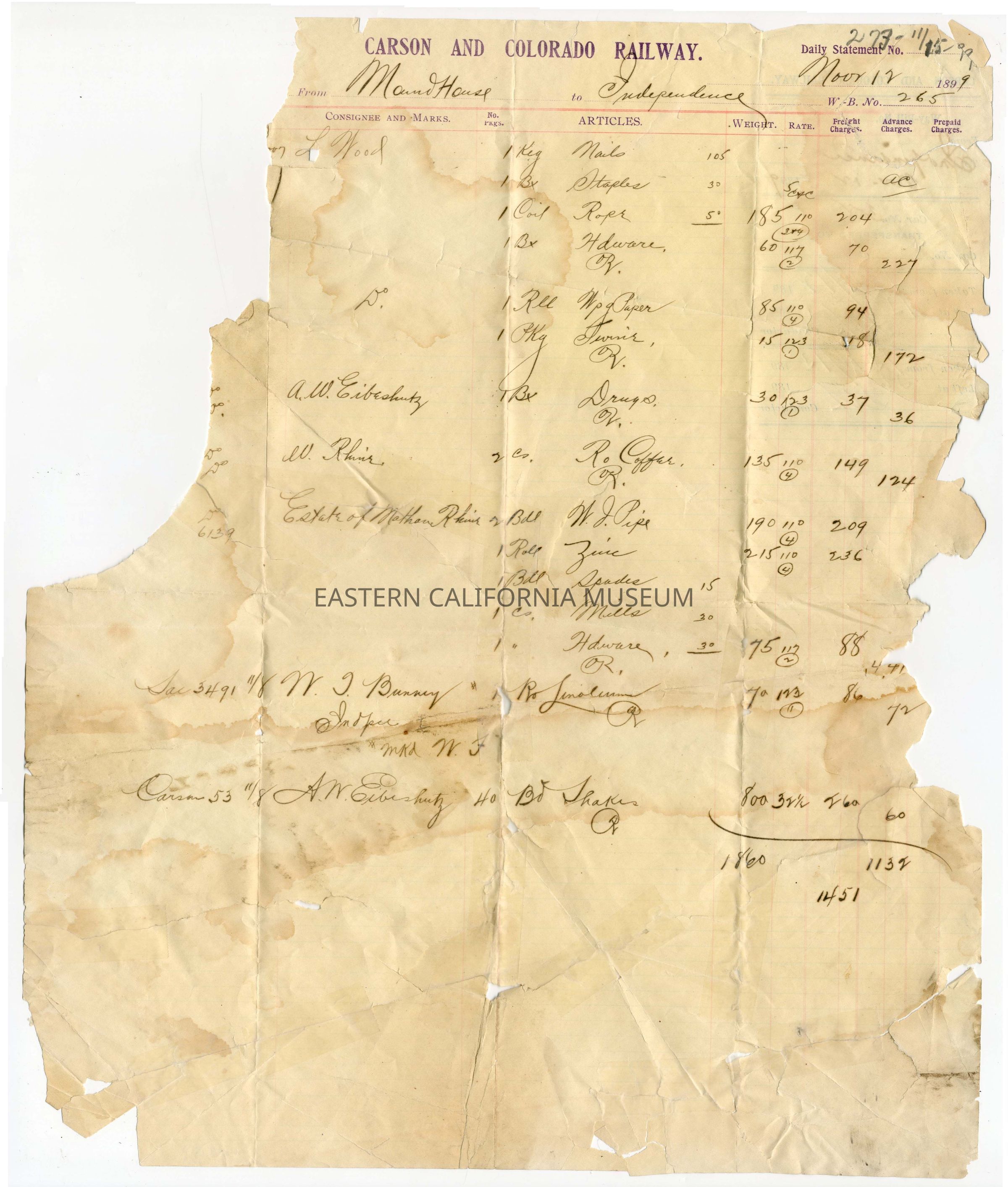 Carson and Colorado Railway waybill from Mound House to Independence dated 11/12/1899 for items shipped in car no. 308. Names listed include L. Wood, A W. Eibershutz, W. Rhine, Estate of Nathan Rhine, and W. T. Bunney.Collection