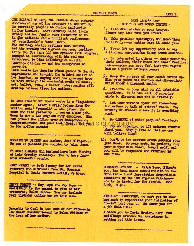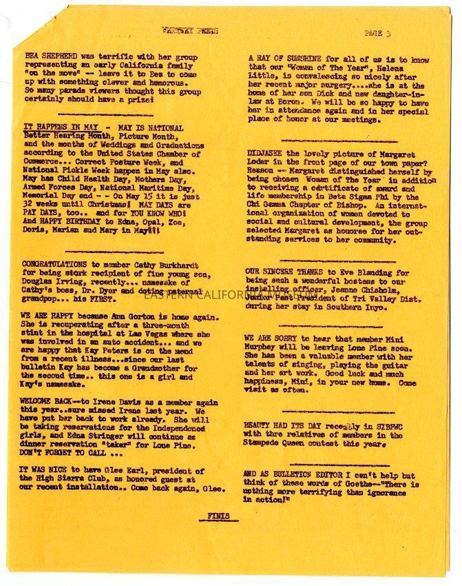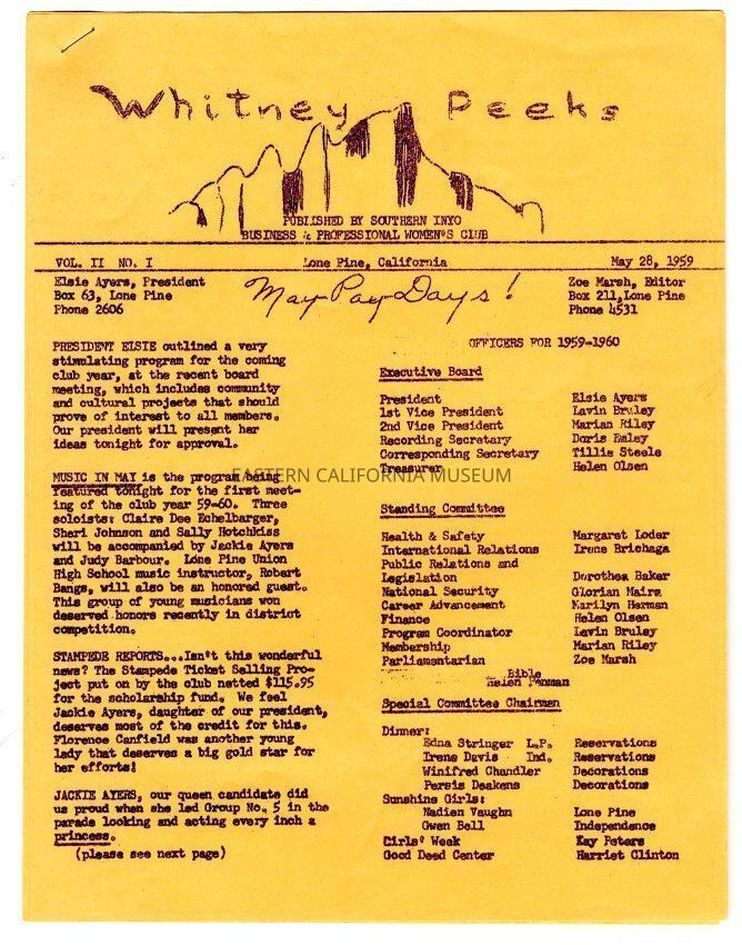 The "Whitney Peeks" newsletter published by the Southern Inyo Business and Professional Women's Club. This one is identified as, "Vol. II, No. I" and "May 28, 1959." Three letter sized pages all of which are an orange color.Collection