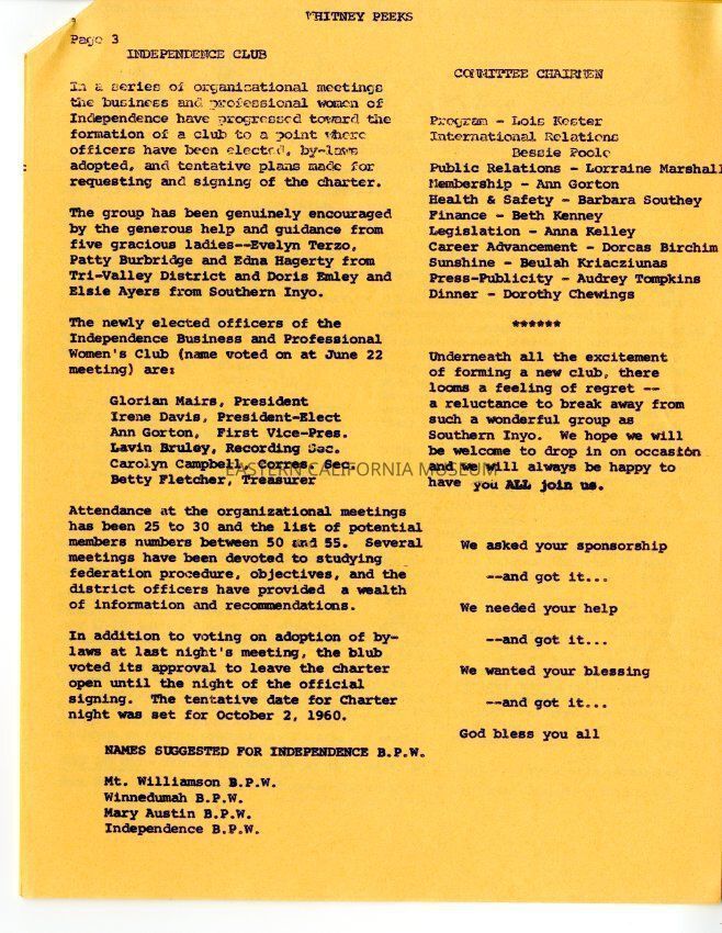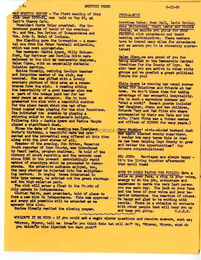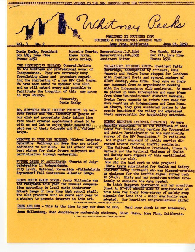 The "Whitney Peeks" newsletter published by the Southern Inyo Business and Professional Women's Club. This one is identified as, "Vol. 3, No. 2" and "June 23, 1960." Three letter sized pages all of which are an orange color.Collection