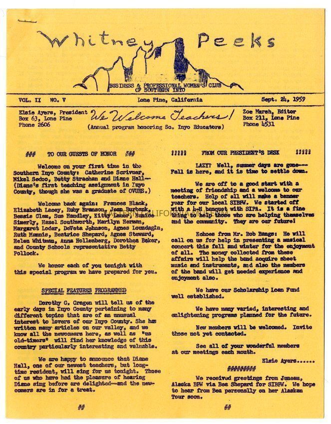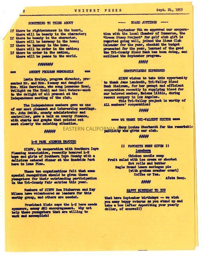 The "Whitney Peeks" newsletter published by the Southern Inyo Business and Professional Women's Club. This one is identified as, "Vol. II, No. V" and "Sept. 24, 1959." Three letter sized pages all of which are an orange color.Collection