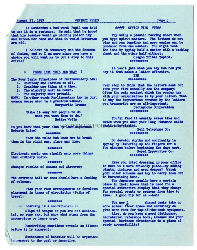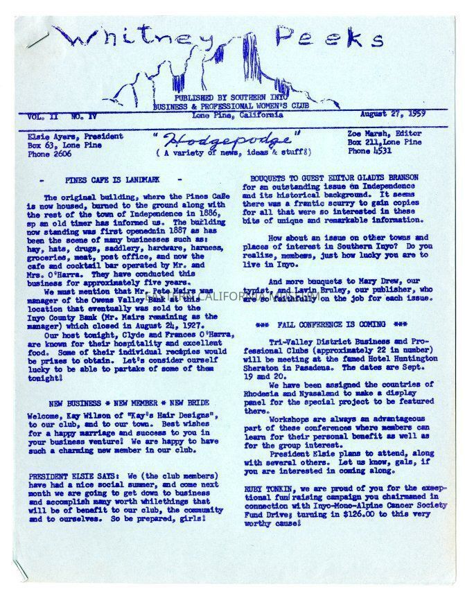 The "Whitney Peeks" newsletter published by the Southern Inyo Business and Professional Women's Club. This one is identified as, "Vol. II, No. IV" and "August 27, 1959." Three letter sized pages all of which are a blue-green color.Collection