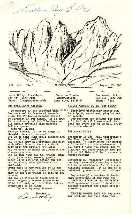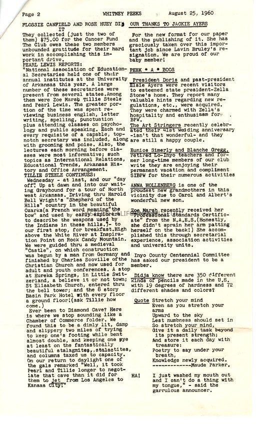 The "Whitney Peeks" newsletter published by the Southern Inyo Business and Professional Women's Club. This one is identified as, "Vol. III, No. 4" and "August 25, 1960." Three legal sized pages.Collection