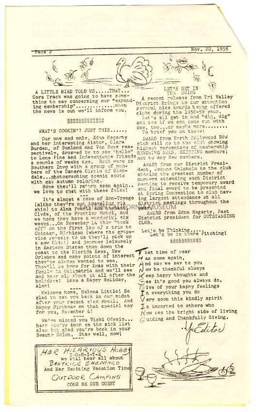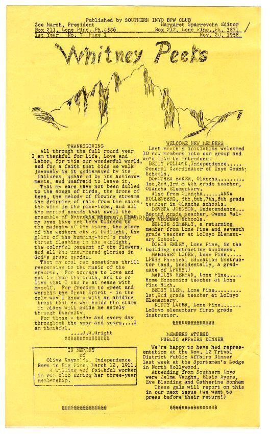 The "Whitney Peeks" newsletter published by the Southern Inyo Business and Professional Women's Club. This one is identified as, "1st Year, No. 7, Page 1" and "November 20, 1958." Two legal sized pages, the first of which is yellow, the second is white.Collection
