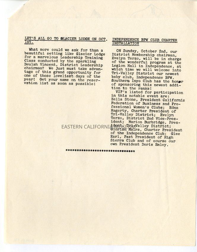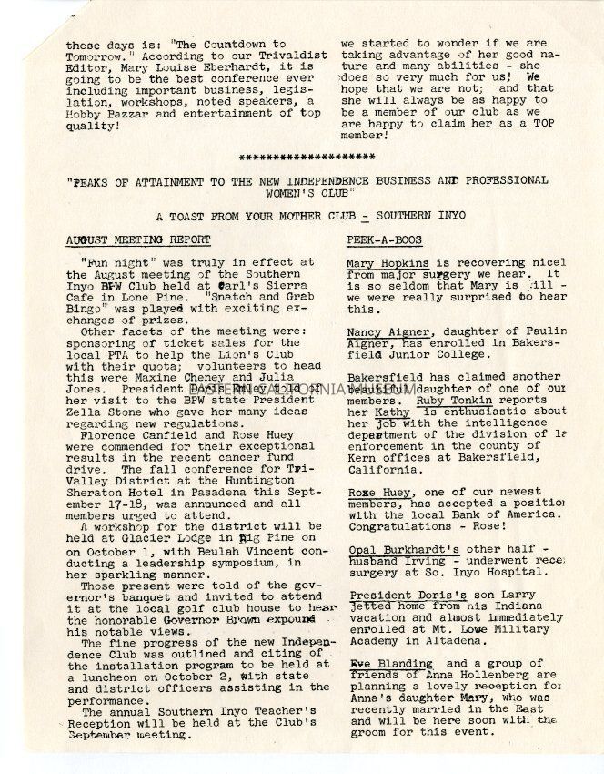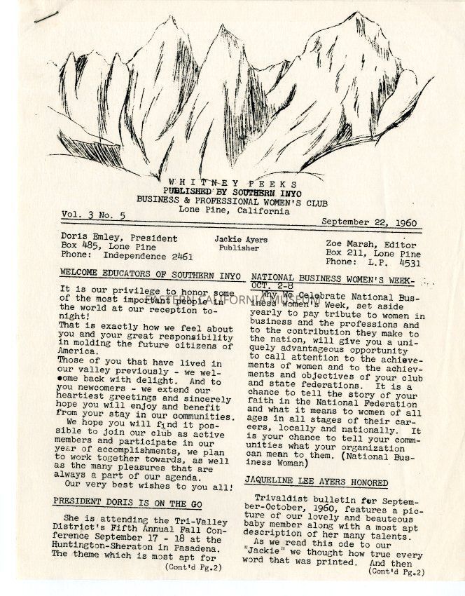 The "Whitney Peeks" newsletter published by the Southern Inyo Business and Professional Women's Club. This one is identified as, "Vol. 3, No. 5" and "September 22, 1960." Three letter sized pages.Collection