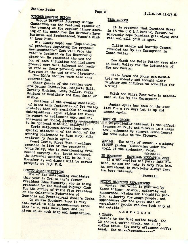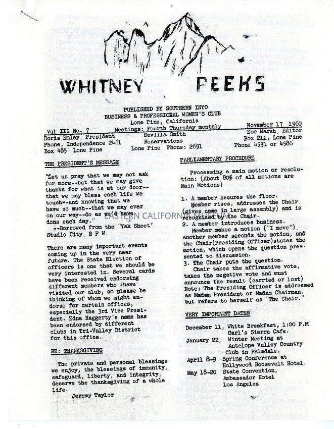 The "Whitney Peeks" newsletter published by the Southern Inyo Business and Professional Women's Club. This one is identified as, "Vol. 3, No. 7" and "November 17, 1960." Two pages.Collection