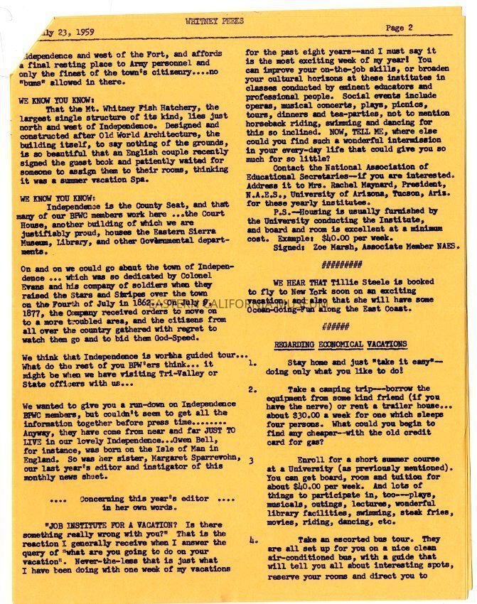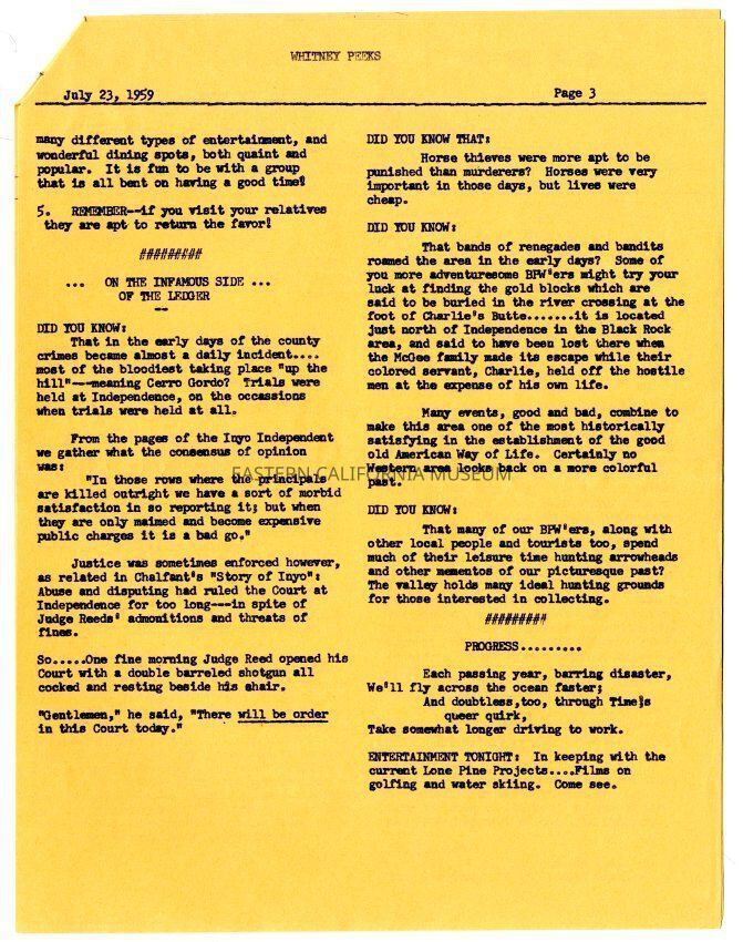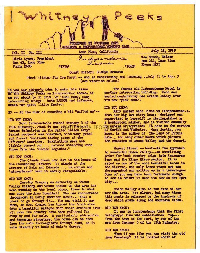 The "Whitney Peeks" newsletter published by the Southern Inyo Business and Professional Women's Club. This one is identified as, "Vol. II, No. III" and "July 23, 1959." Three letter sized pages all of which are an orange color.Collection