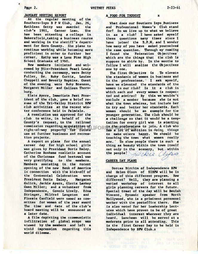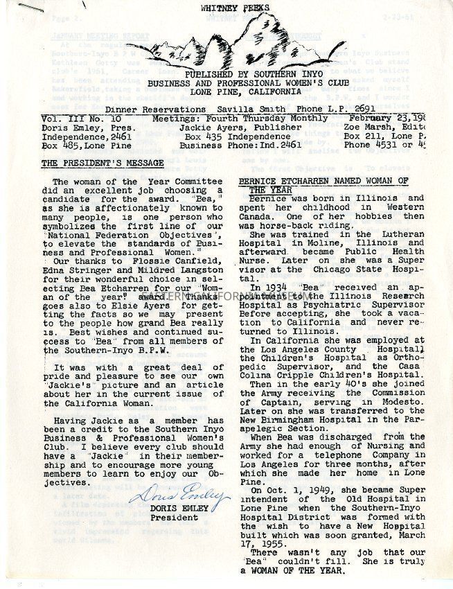 The "Whitney Peeks" newsletter published by the Southern Inyo Business and Professional Women's Club. This one is identified as, "Vol. 3, No. 10" and "February 23, 1961." Two pages.Collection