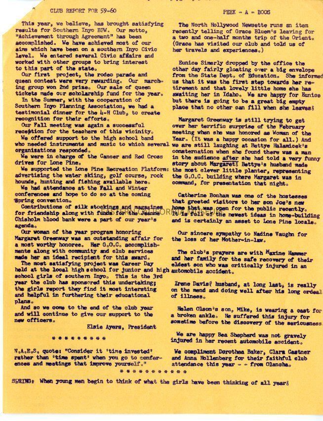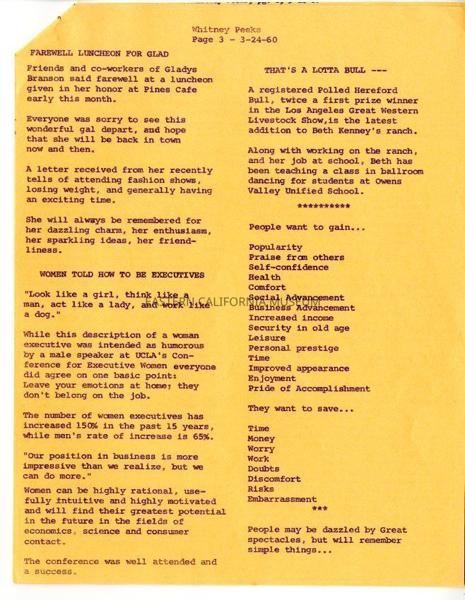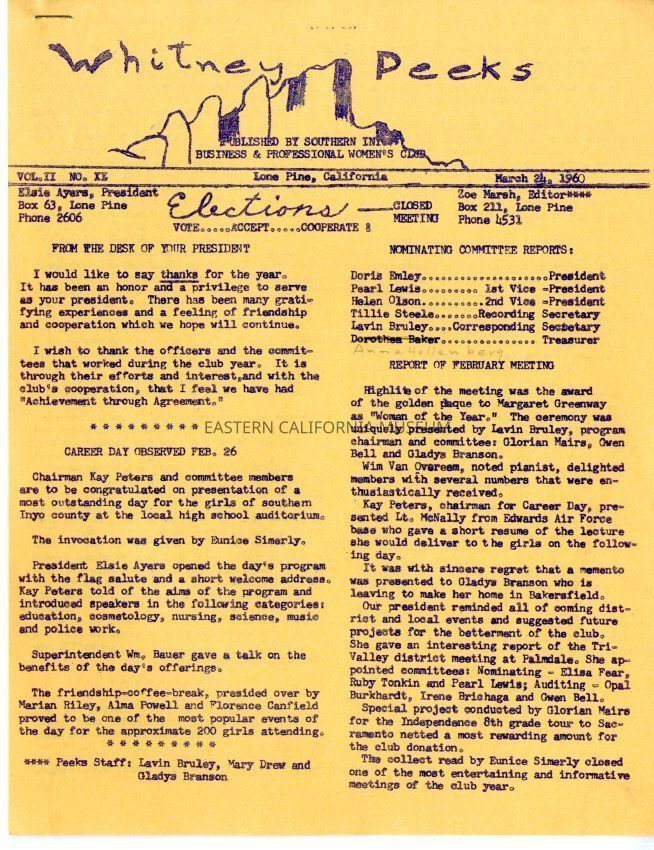 The "Whitney Peeks" newsletter published by the Southern Inyo Business and Professional Women's Club. This one is identified as, "Vol. II, No. XI" and "March 24, 1960." Three letter sized pages all of which are an orange color.Collection