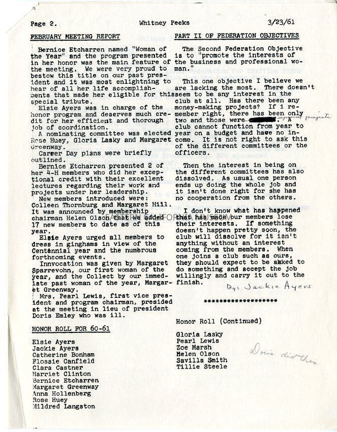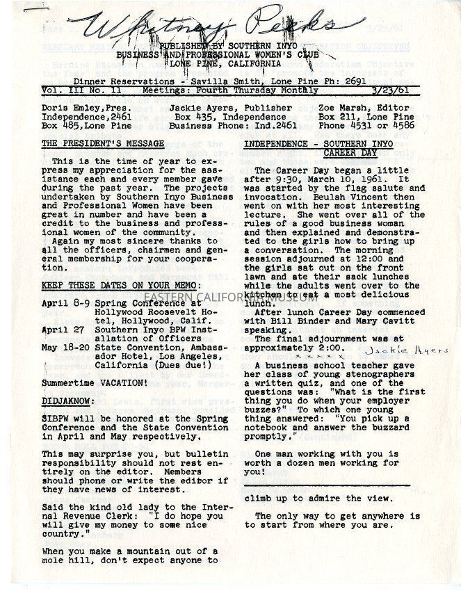 The "Whitney Peeks" newsletter published by the Southern Inyo Business and Professional Women's Club. This one is identified as, "Vol. 3, No. 11" and "March 23, 1961." Three pages.Collection