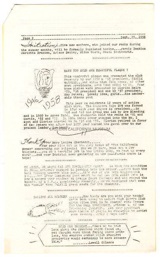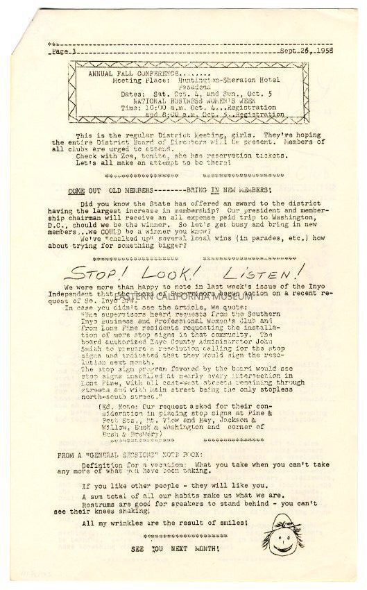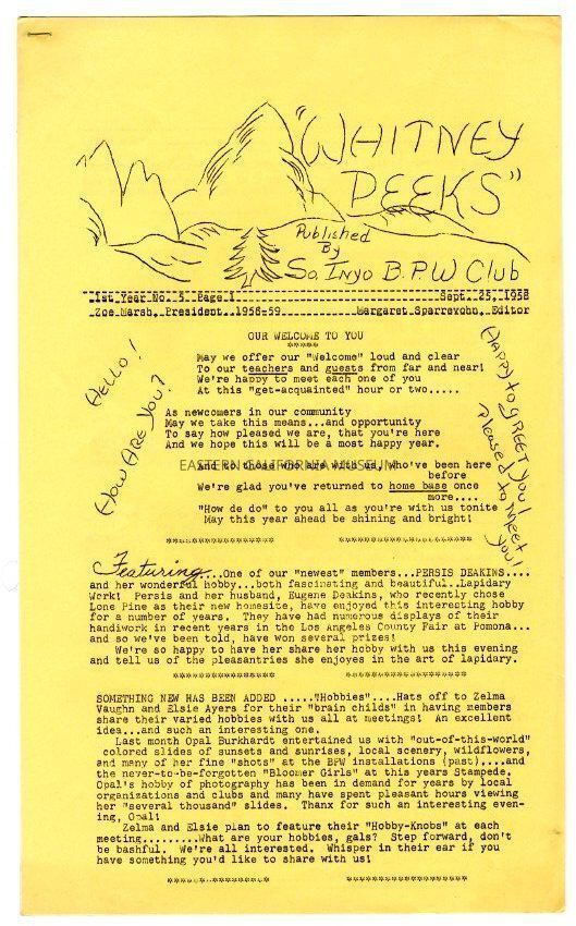 The "Whitney Peeks" newsletter published by the Southern Inyo Business and Professional Women's Club. This one is identified as, "1st Year, No. 5, Page 1" and "Sept. 25, 1958." Three legal sized pages, the first of which is yellow, and the second and third are white.Collection
