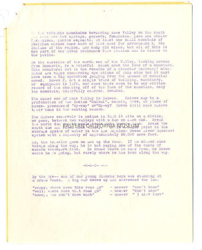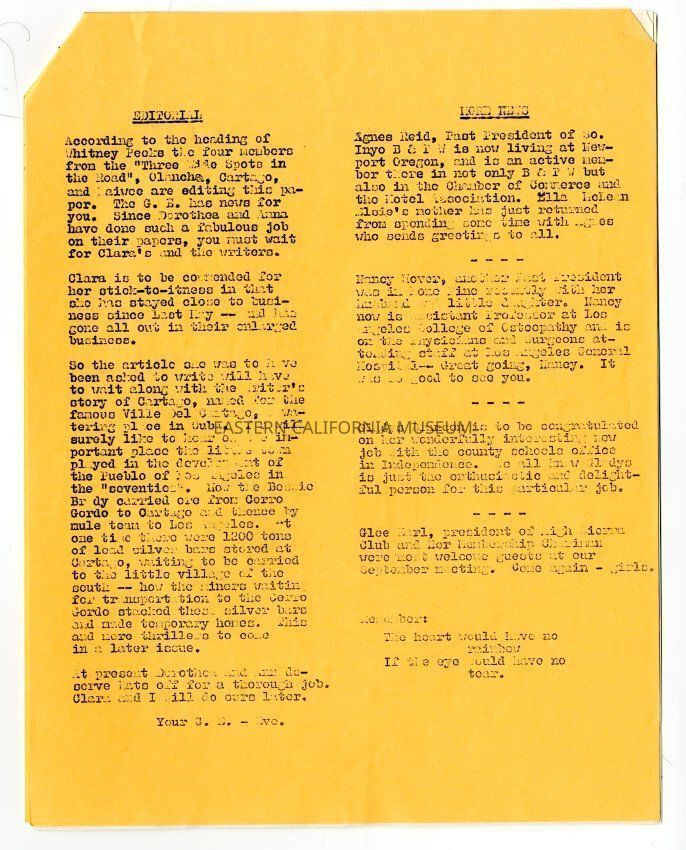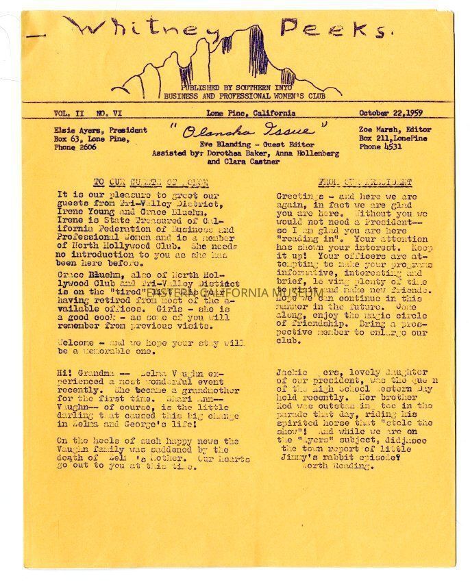 The "Whitney Peeks" newsletter published by the Southern Inyo Business and Professional Women's Club. This one is identified as, "Vol. II, No. VI" and "October 22, 1959." Six letter sized pages, the first two of which are an orange color and the last four are white.Collection