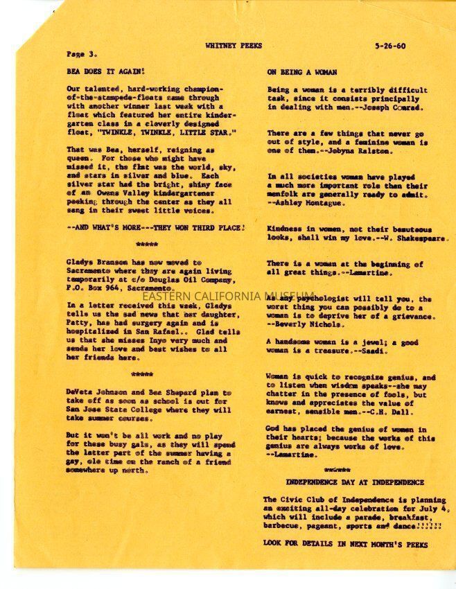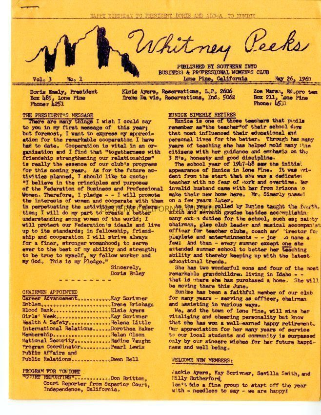 The "Whitney Peeks" newsletter published by the Southern Inyo Business and Professional Women's Club. This one is identified as, "Vol. 3, No. 1" and "May 26, 1960." Three letter sized pages all of which are an orange color.Collection