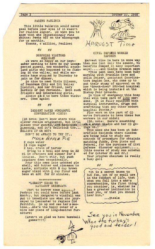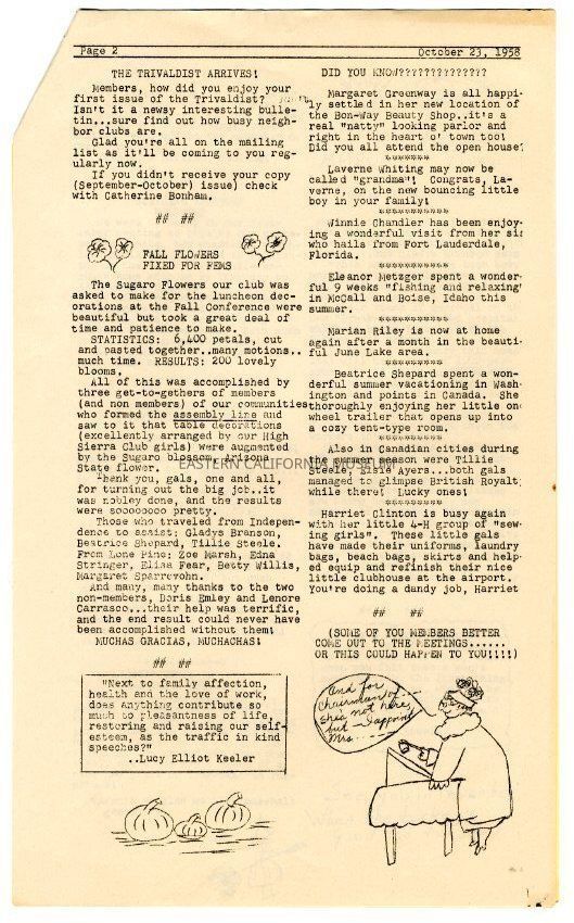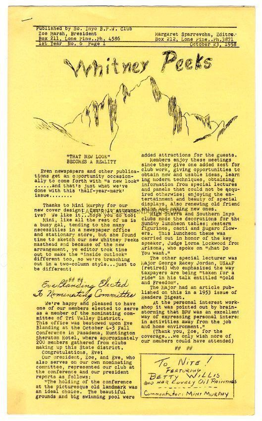 The "Whitney Peeks" newsletter published by the Southern Inyo Business and Professional Women's Club. This one is identified as, "1st Year, No. 6, Page 1" and "October 23, 1958." Three legal sized pages, the first of which is yellow, and the second and third are white.Collection