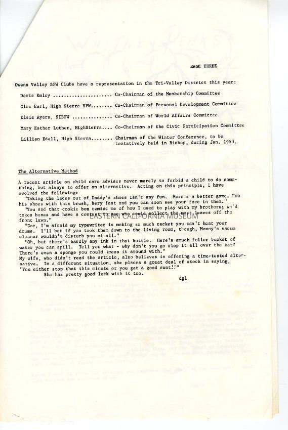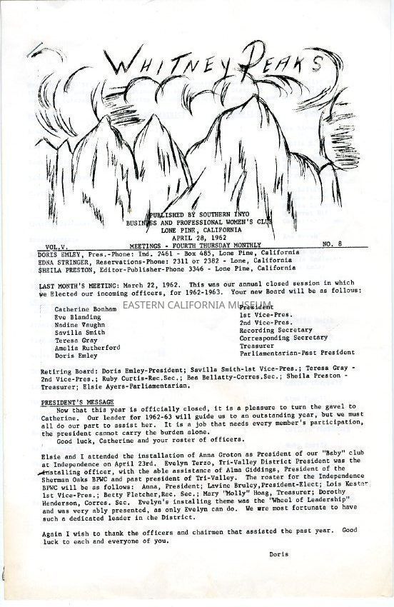 The "Whitney Peeks" newsletter published by the Southern Inyo Business and Professional Women's Club. This one is identified as, "Vol. V, No. 8" and "April 28, 1962." Three oversized pages.Collection