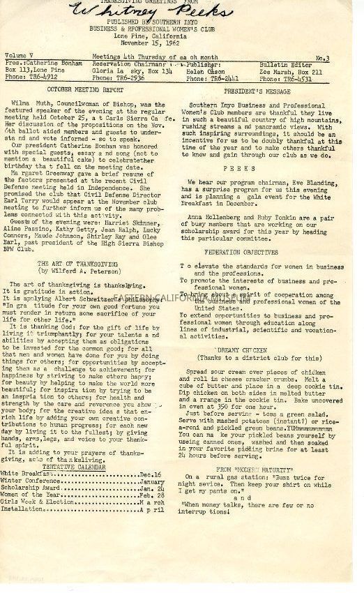 The "Whitney Peeks" newsletter published by the Southern Inyo Business and Professional Women's Club. This one is identified as, "Vol. V, No. 3" and "November 15, 1962." One legal sized page.Collection