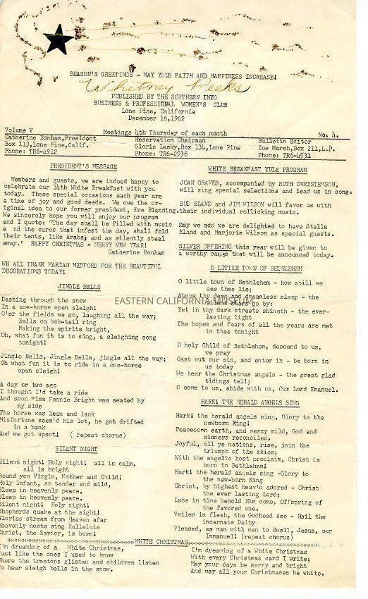 The "Whitney Peeks" newsletter published by the Southern Inyo Business and Professional Women's Club. This one is identified as, "Vol. V, No. 4" and "December 16, 1962." One legal sized page. This special holiday edition is embellished with glitter and a star sticker.Collection