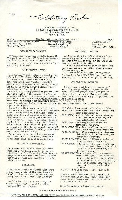 The "Whitney Peeks" newsletter published by the Southern Inyo Business and Professional Women's Club. This one is identified as, "Vol. V, No. 8" and "April 25, 1963." One legal sized page.Collection