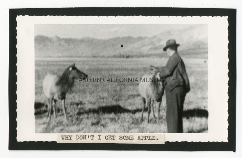 Blurry photo of a man (Walter Dow?) hand-feeding apples to elk in the Tinnemaha area. The photo is printed on scalloped paper.
