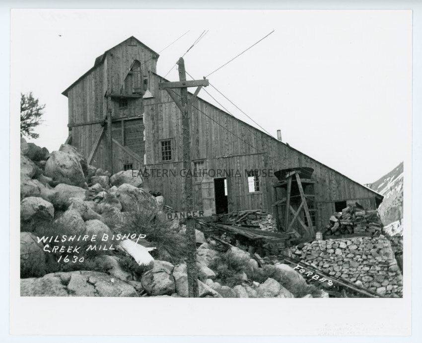 Photo of a large wooden structure with power lines and a sign that says "danger." Written on front: Wilshire Bishop Creek Mill, 1630, Forbes.