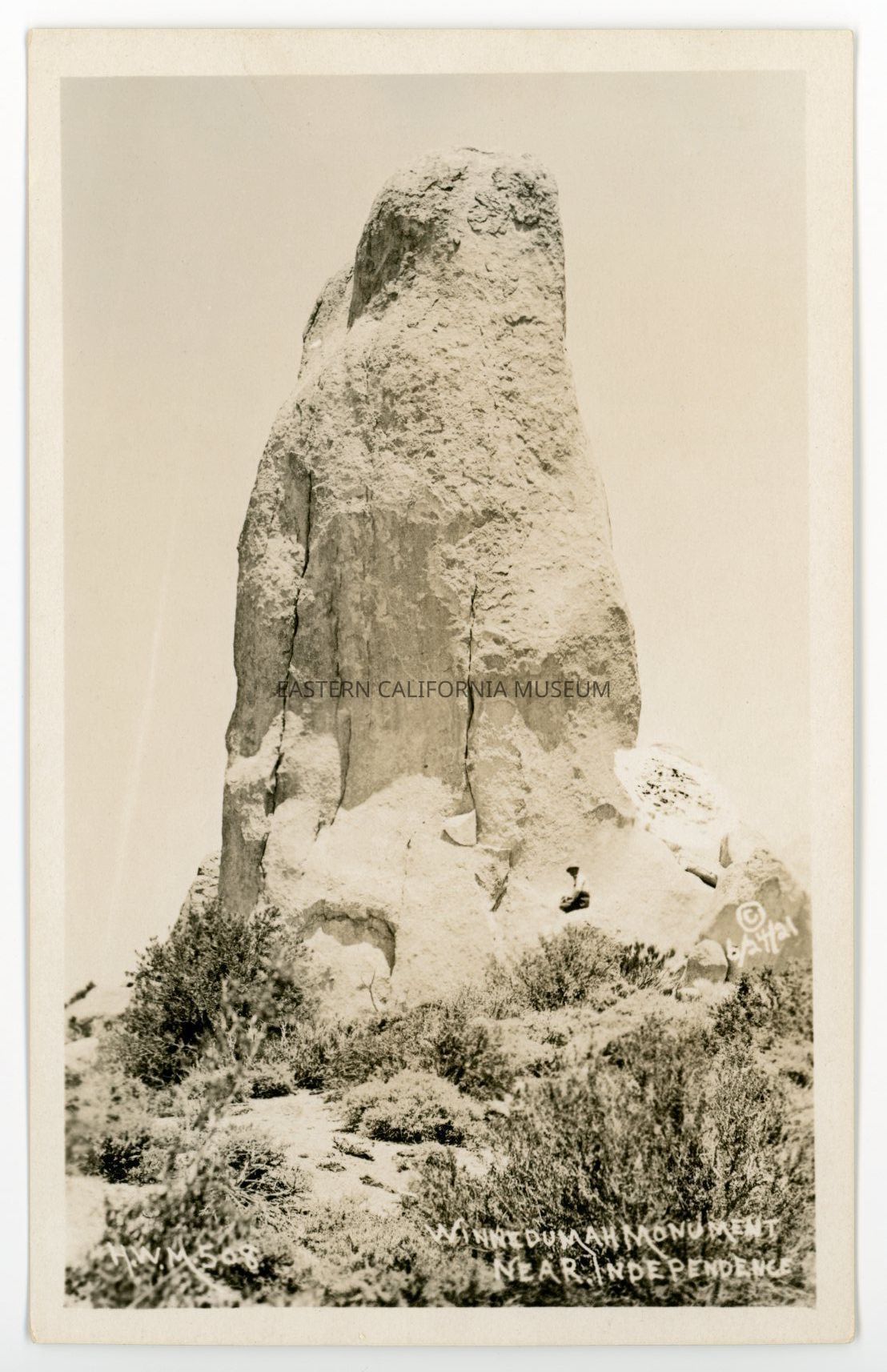 Photo postcard titled, "Winnedumah Monument Near Independence" taken by photographer H. W. Mendenhall and given his ID #508. Copyright 6/24/21. There is a person sitting at the base of the stone.Photograph Details
