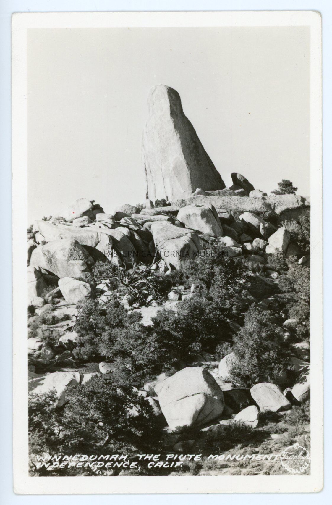 Photo postcard titled, "Winnedumah, the Piute Monument, Independence, Calif." Photographer was Burton Frasher of Pomona.Collection