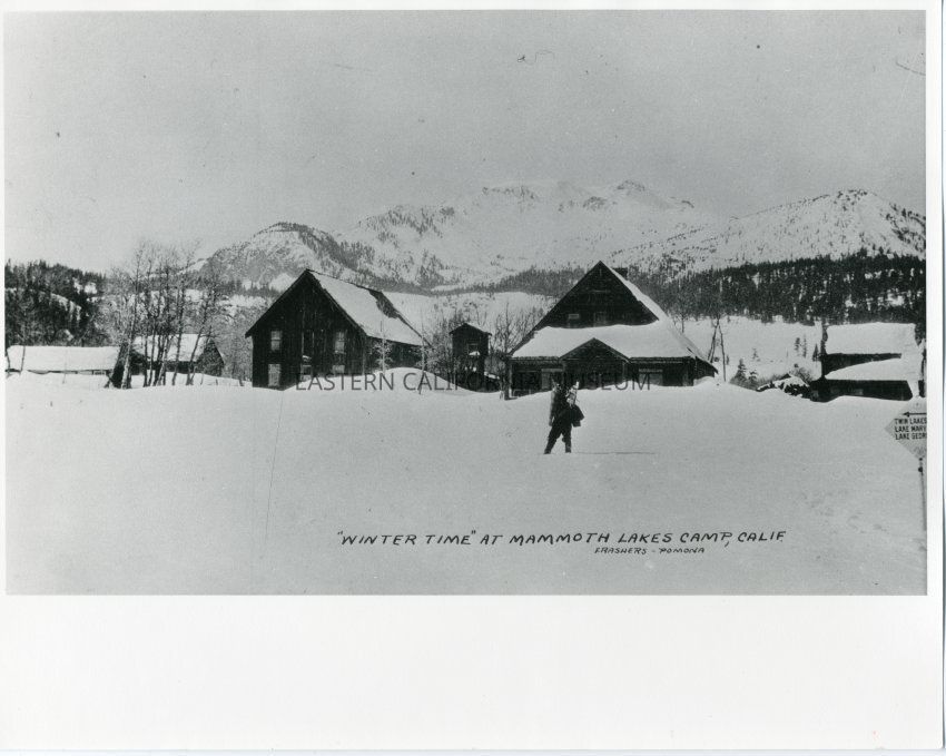 B&W matte print:snowy scene, cabins, man with pack, Mammoth Mountain in background; directional sign lower right side: Twin Lakes, Lake Mary, Lake George