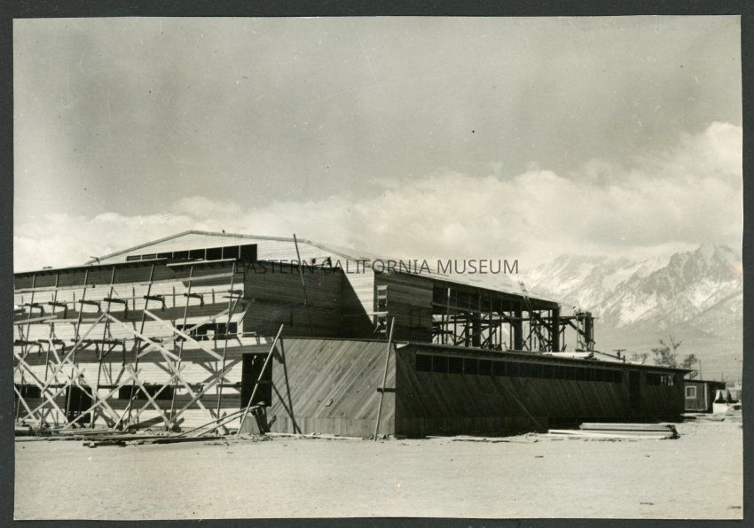 Photograph of the Manzanar Auditorium under construction taken by an unknown War Relocation Authority Photographer.