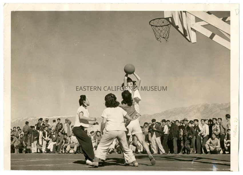 WRA no. B-204: photograph of four girls playing basketball with crowd watching at ManzanarEntry/Object ID