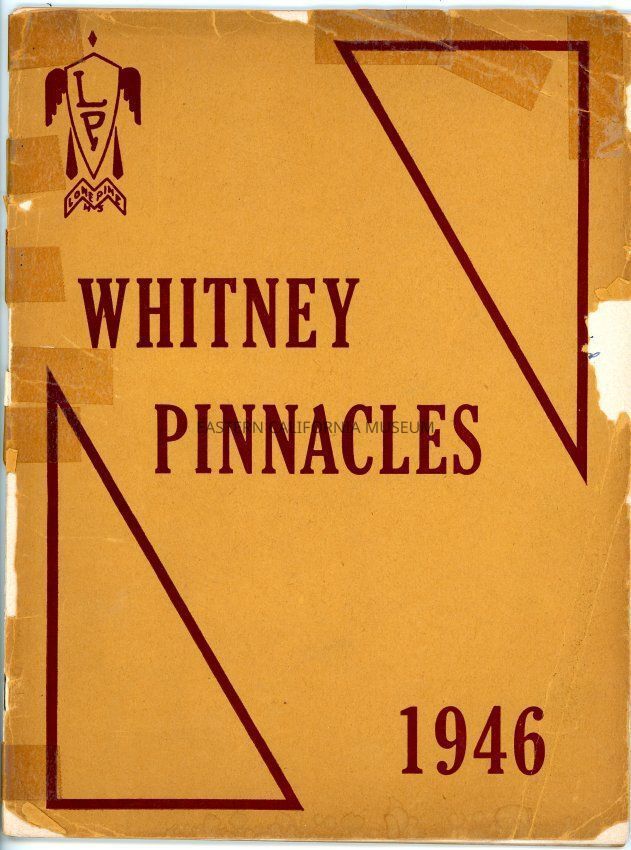 Lone Pine Yearbook "Whitney Pinnacles" 1946. It is in fairly poor condition, with many tears and extensive taping. It belonged to Miss Virginia Hillard, who taught Spanish 1st and 2nd years, Science, and Physical Education Jr. and Sr. high. It has many handwritten messages and notes throughout.