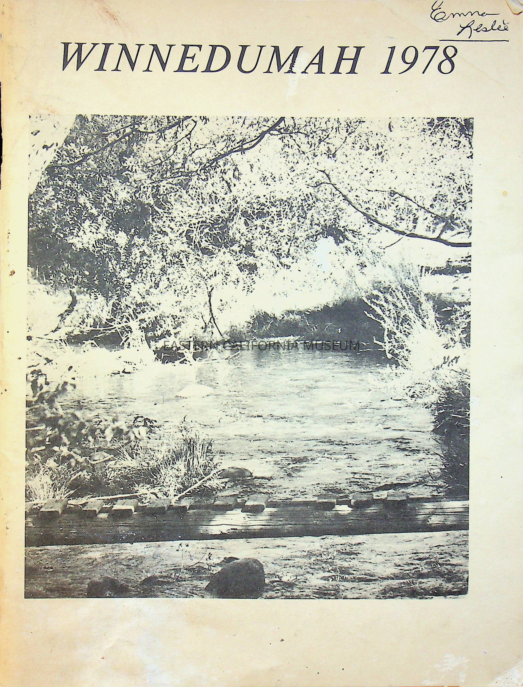 Owens Valley High School yearbook, the Winnedumah, 1978. It has a lot of messages written throughout the pages and belonged to a student named Emma Leslie. At some point former museum director Phil Walker acquired it.Collection