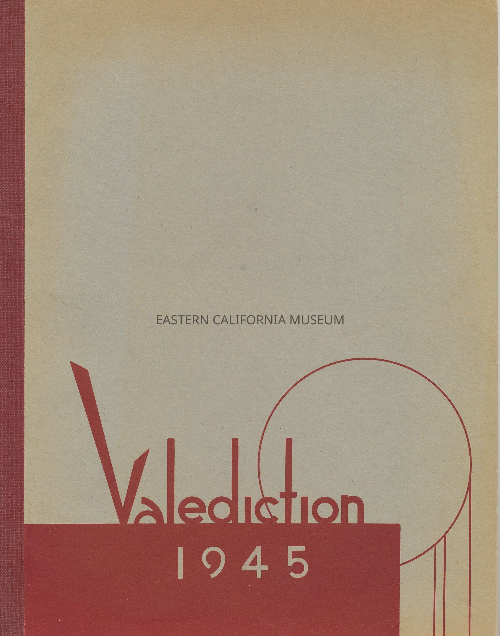 Manzanar High School yearbook titled Valediction, 1945. Gray with red graphics, red spine, paperback.