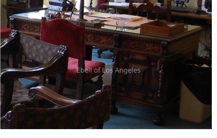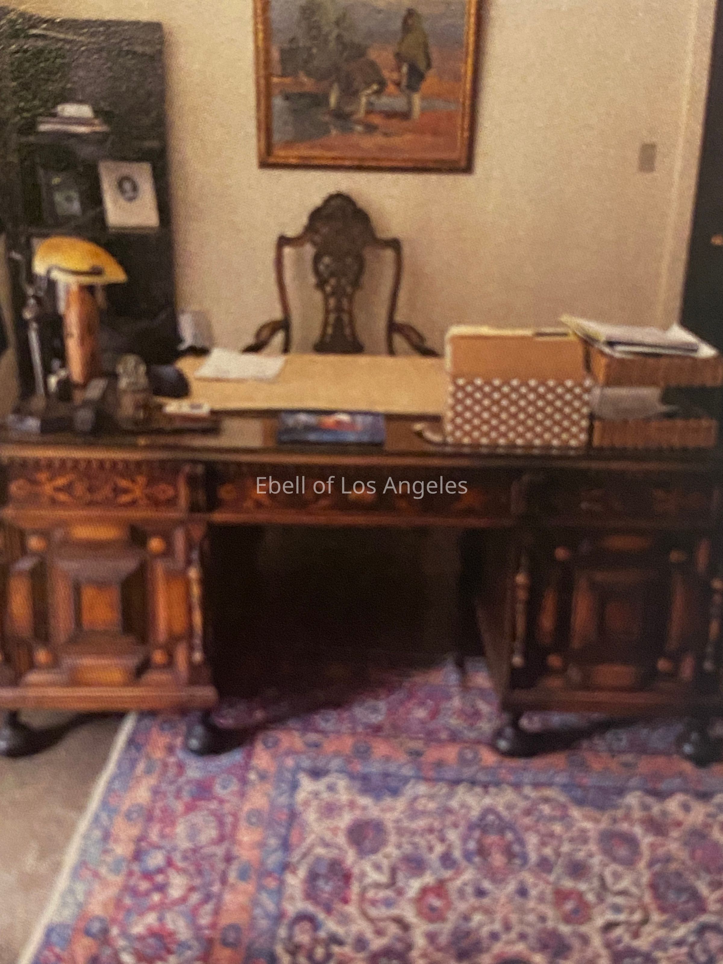 Baroque style carved walnut pedestal desk with turned post accents and inlaid wood motifs.