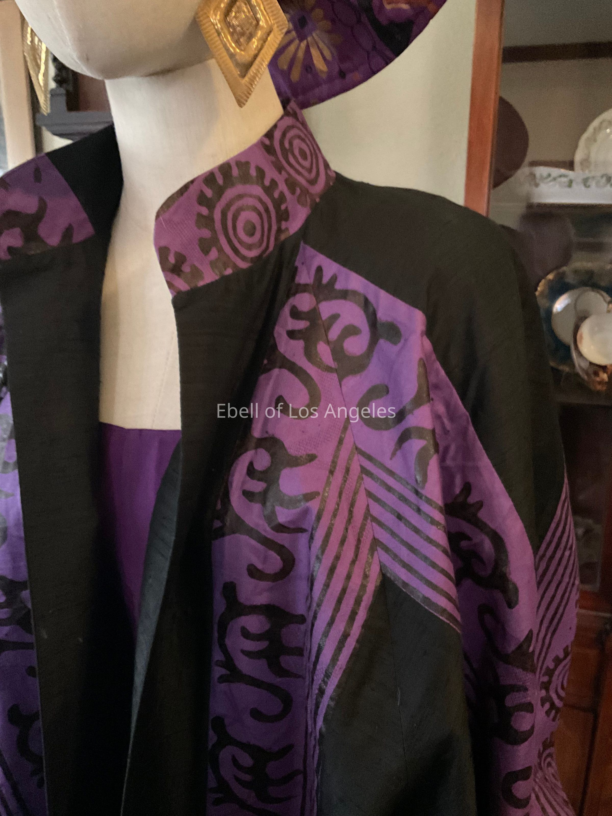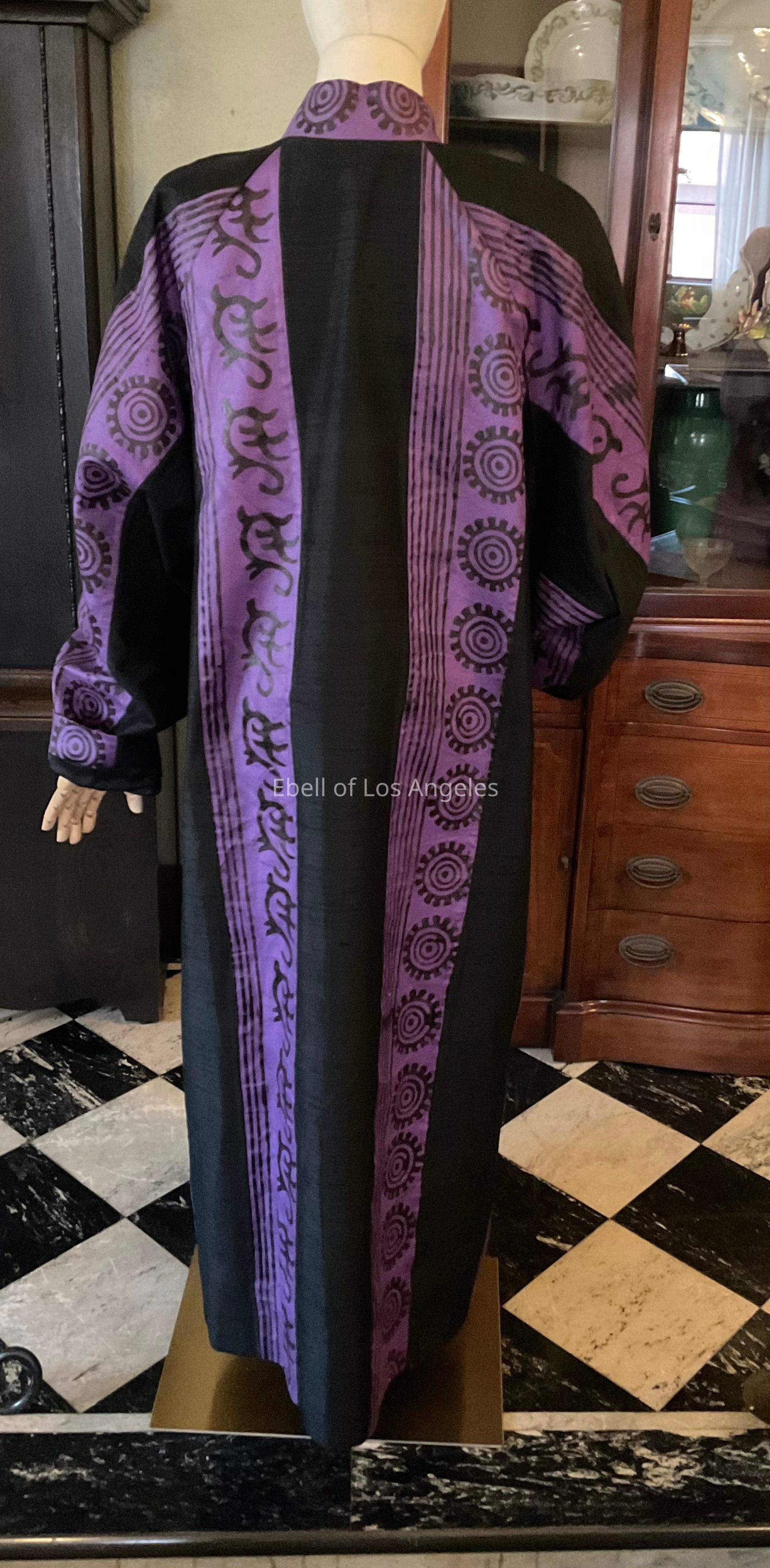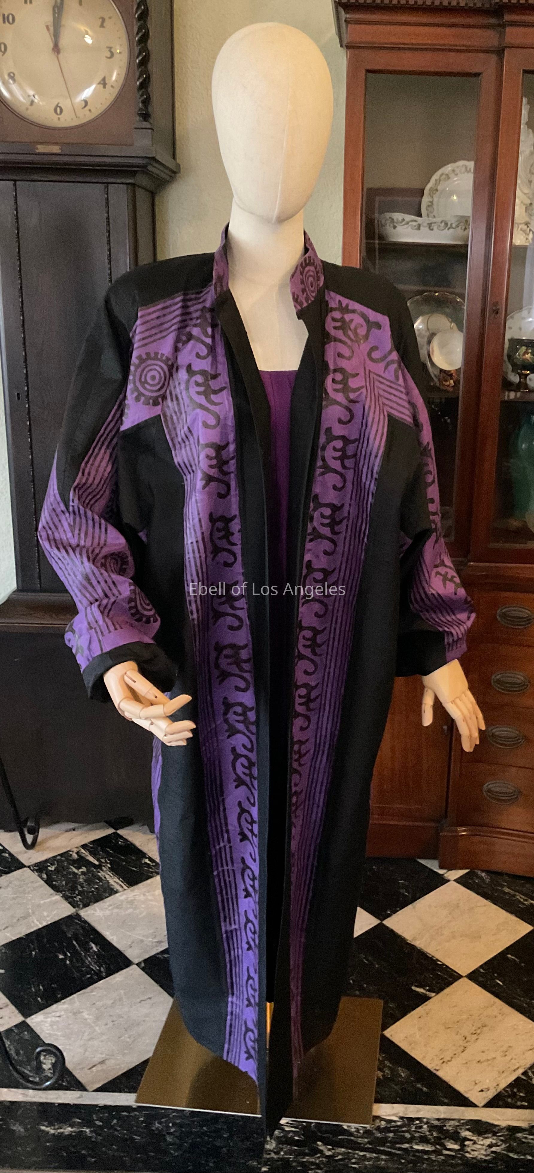 Open front coat with vertical purple panels bearing West African adinkra symbolsCollection