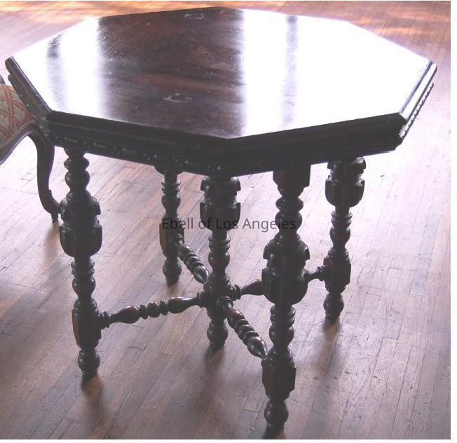Baroque style walnut octagonal occasional/ library table with turned legs and carving along the apron. Four perimeter turned legs and one center leg connected by turned stretcher bars displaying square and oval accents.Collection