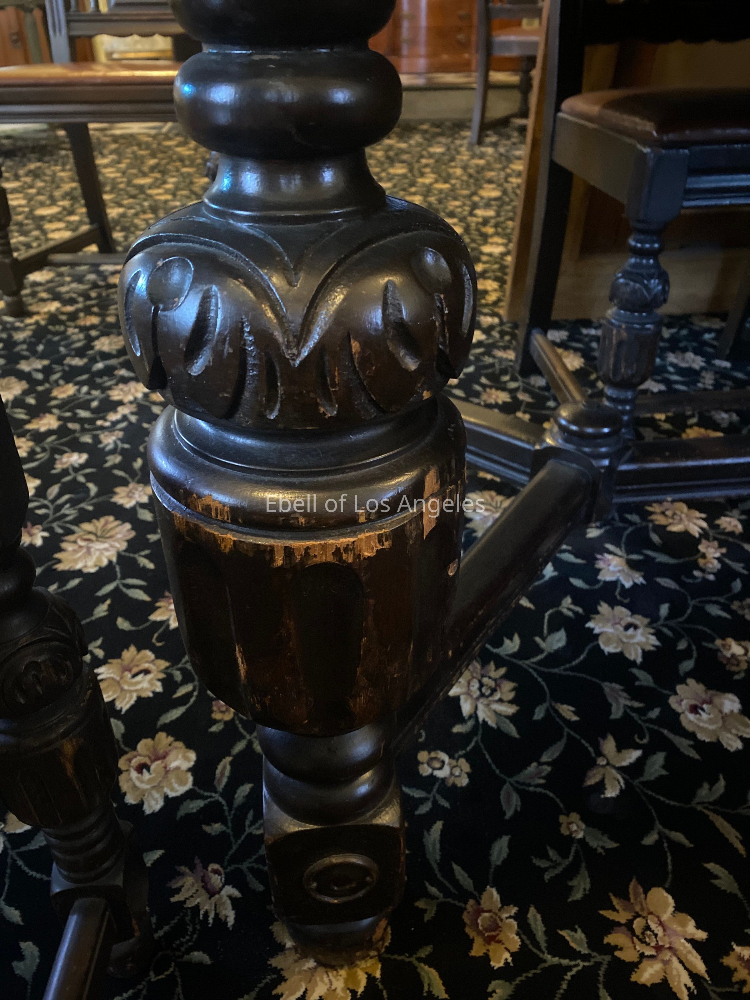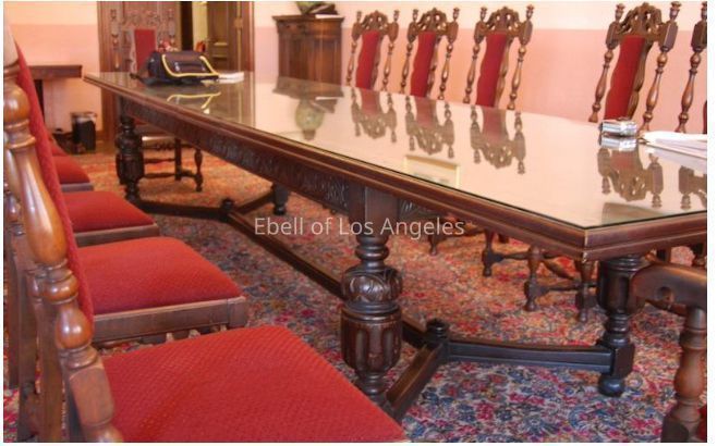 Jacobean style carved walnut extension table with heavily carved legs and apron and a Y shaped stretcher at base. The table is covered by two large pieces of glass.Collection