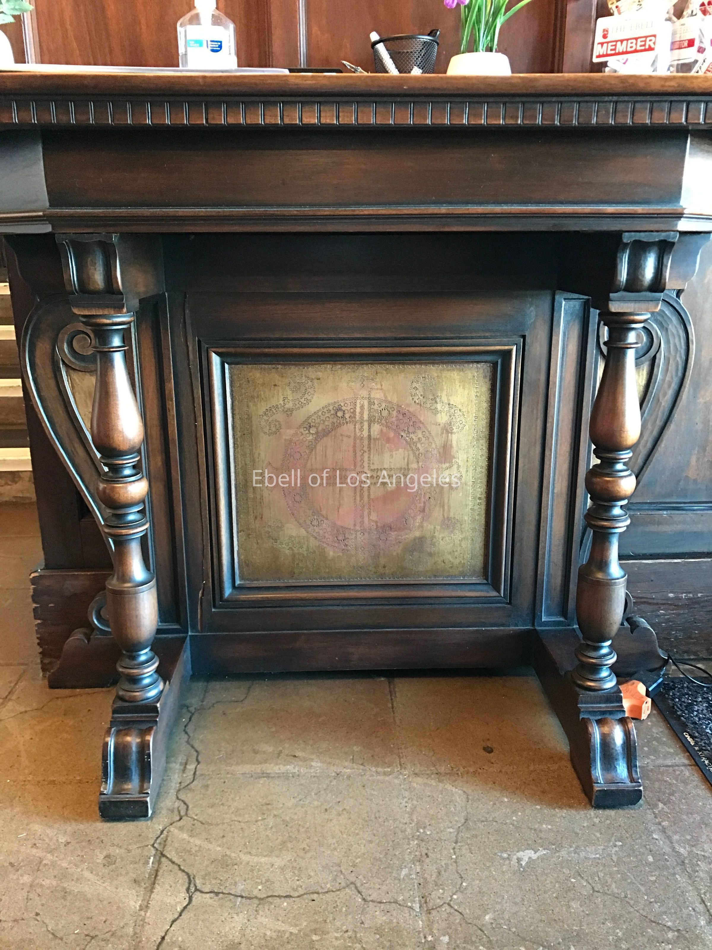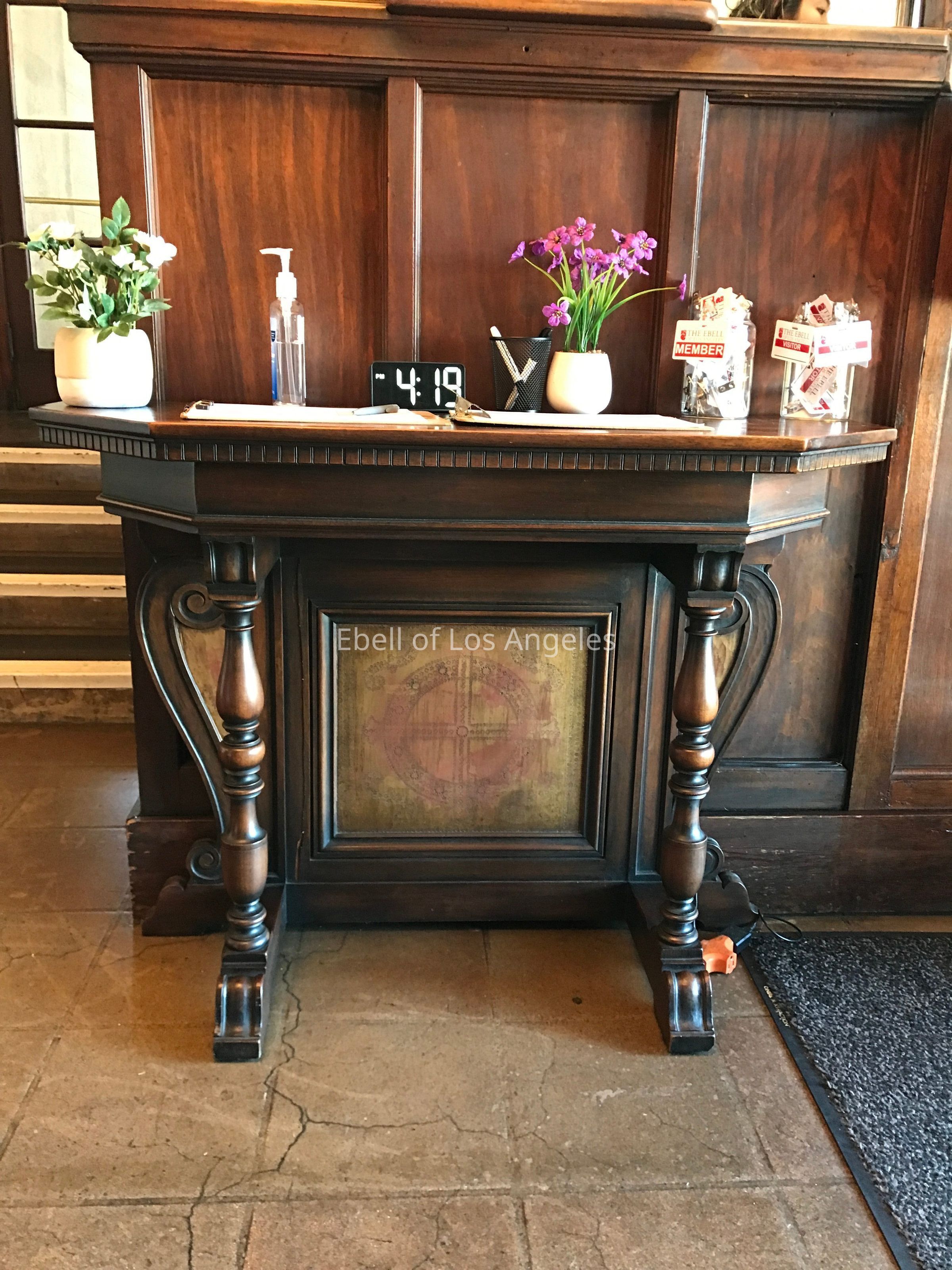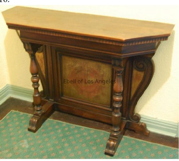 Walnut console table with dentil moulding along lower edge of apron, two front turned legs and lower painted back plate with cabriole legs turned outward.Collection