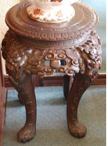 Carved Chinese teakwood stand, late 19th century/early 20th century. Indented frieze in high and pierced relief with cloud scrolls. Dragon head legs end in curling tails.Collection