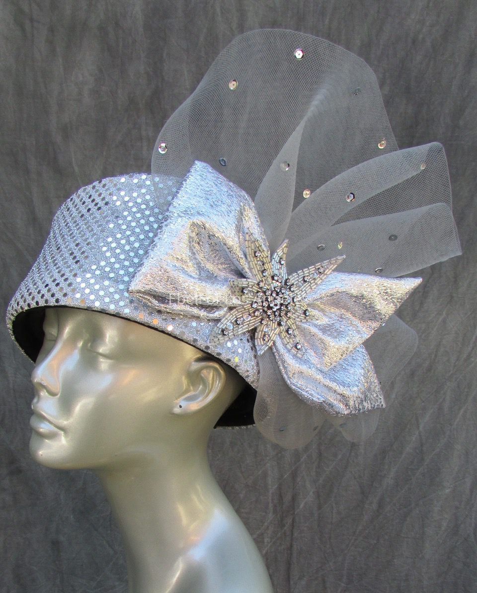 Silver hat with large silver bow, beaded star and crystal studded tulleCollection