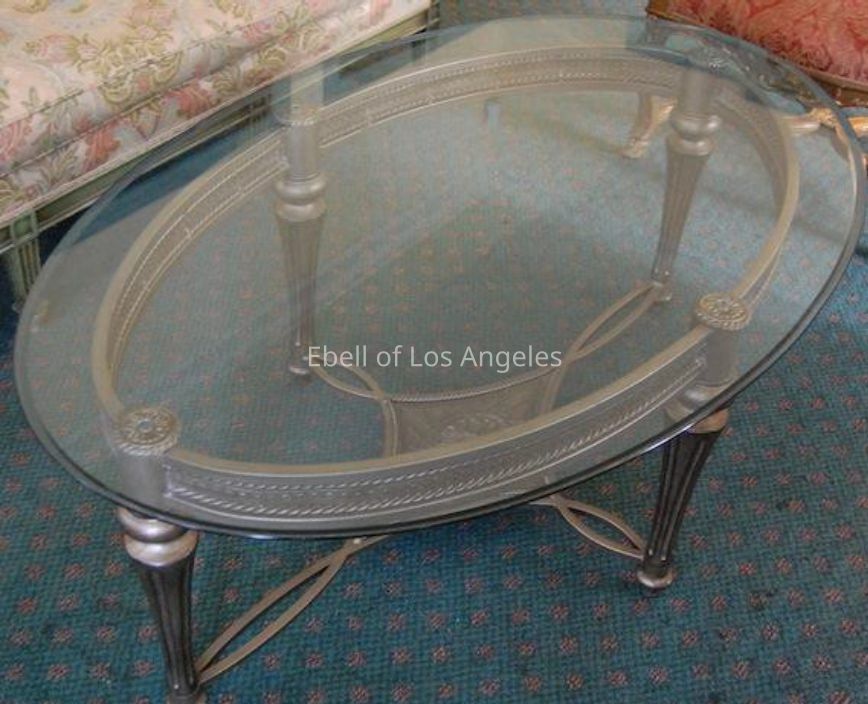 Oval Louis XVI style glass top coffee table with wood and brass accents. The legs are fluted and tapered and the four stretcher bars are curved and meet in the diamond shaped embellished center piece.Material