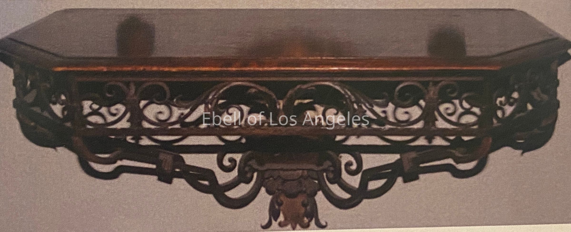 Baroque stye wrought iron console table with walnut top.
