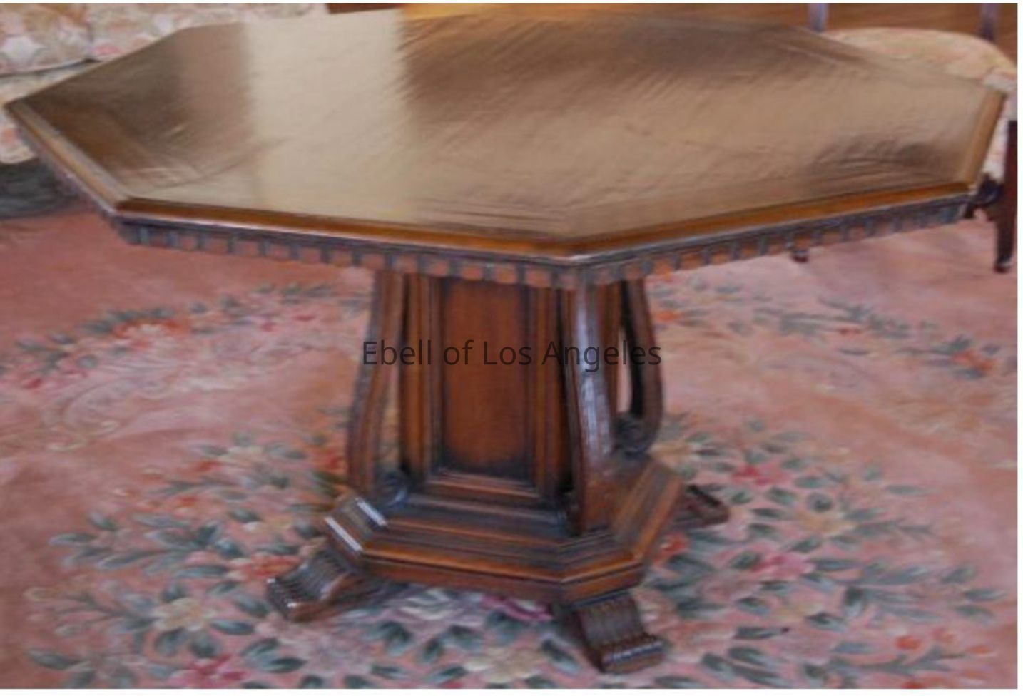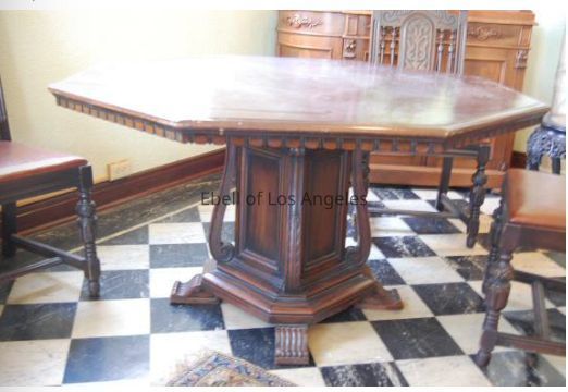 Pair of Renaissance style walnut octagonal dining tables with dental style carving along apron edge. Rectangular pedestal base has four fluted feet and curved and carved three dimensional moulding accents at corners.Collection