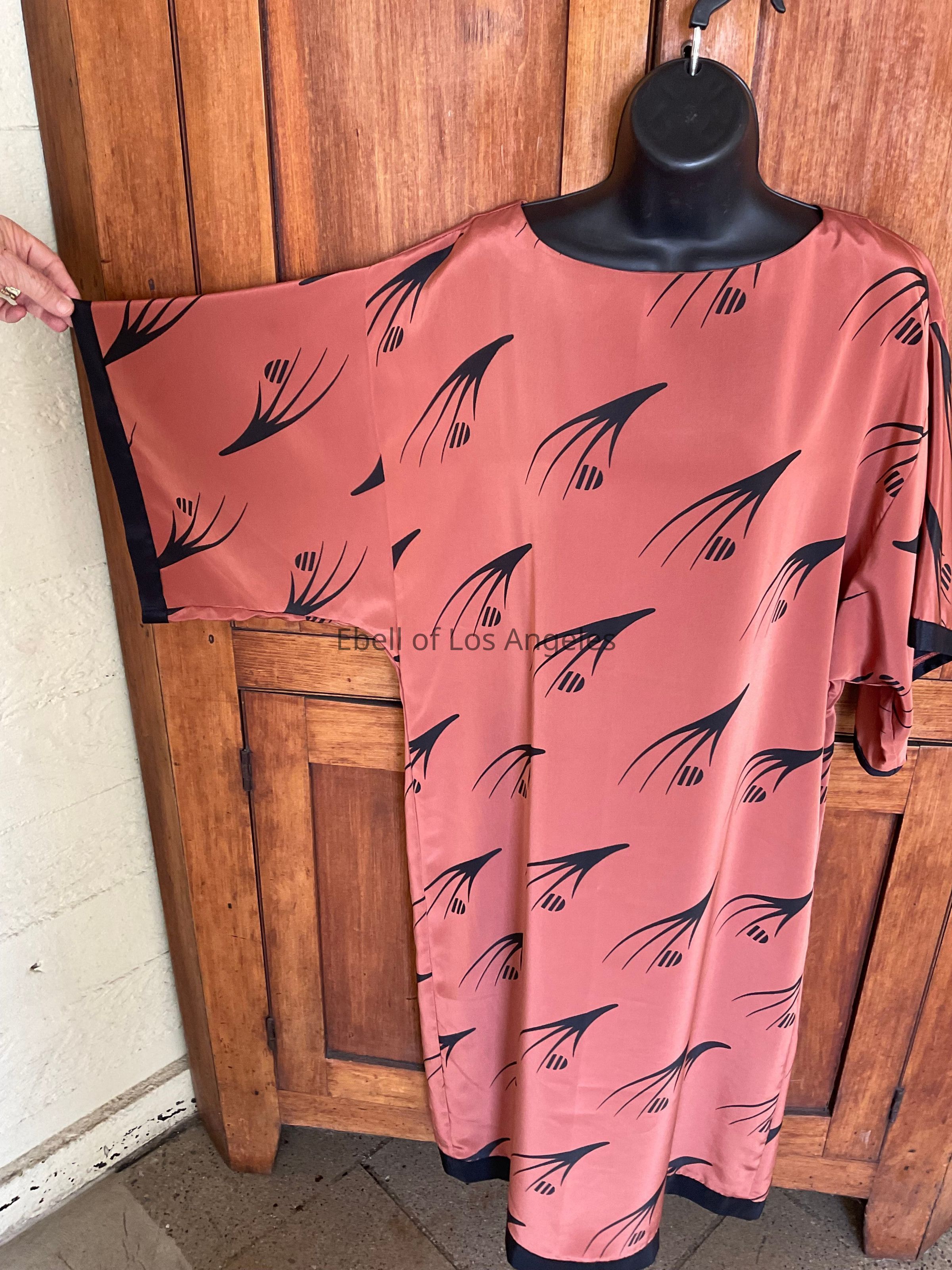 Wide kimono sleeve mid-calf dress with abstract feather print and contrast binding on neck, sleeve and hemCollection