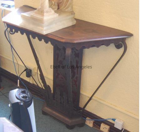 Baroque style wrought iron and walnut console table with scalloped apron edge top and center back carved pedestal panel connected to four scrolled iron accents.Collection
